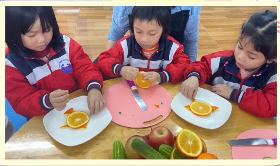 Trước tiên, các con được cô giáo giới thiệu về hoạt động và hướng dẫn cách tạo hình các con vật từ những loại quả quen thuộc 🍎🍊🥒