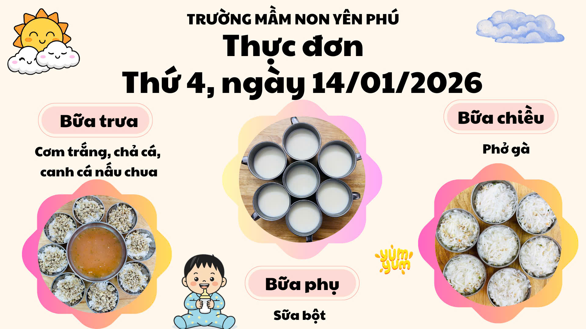 🌤️🍽️ THỰC ĐƠN THỨ 4 – NGÀY 14/01/2026 TRƯỜNG MẦM NON YÊN PHÚ 🏫