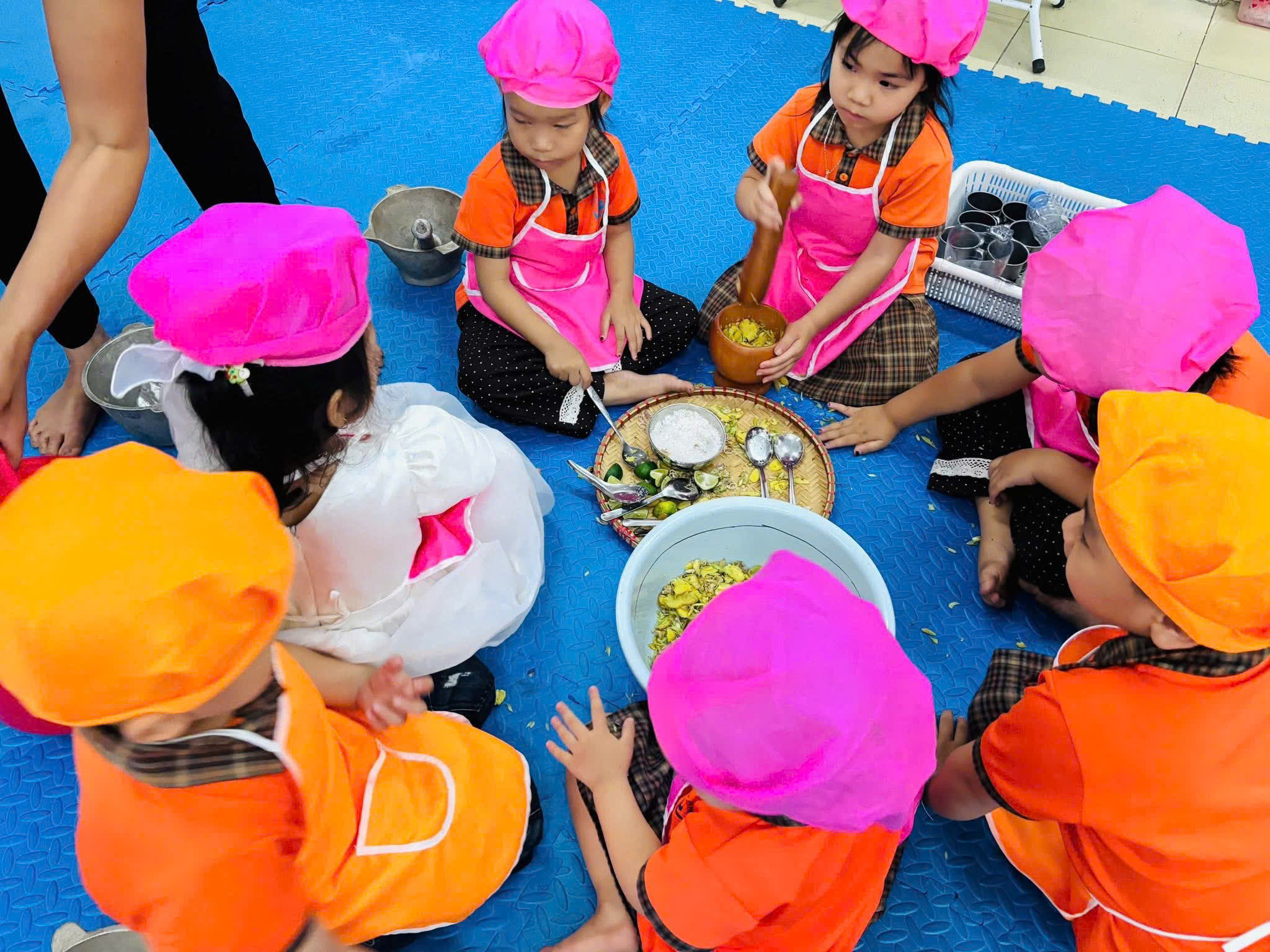 Thông qua hoạt động, các con không chỉ được tìm hiểu về lợi ích của việc ngâm chân đối với sức khỏe mà còn được tự tay lựa chọn nguyên liệu như gừng, sả, chanh, muối… để tạo nên món quà nhỏ dành tặng mẹ. 🌿