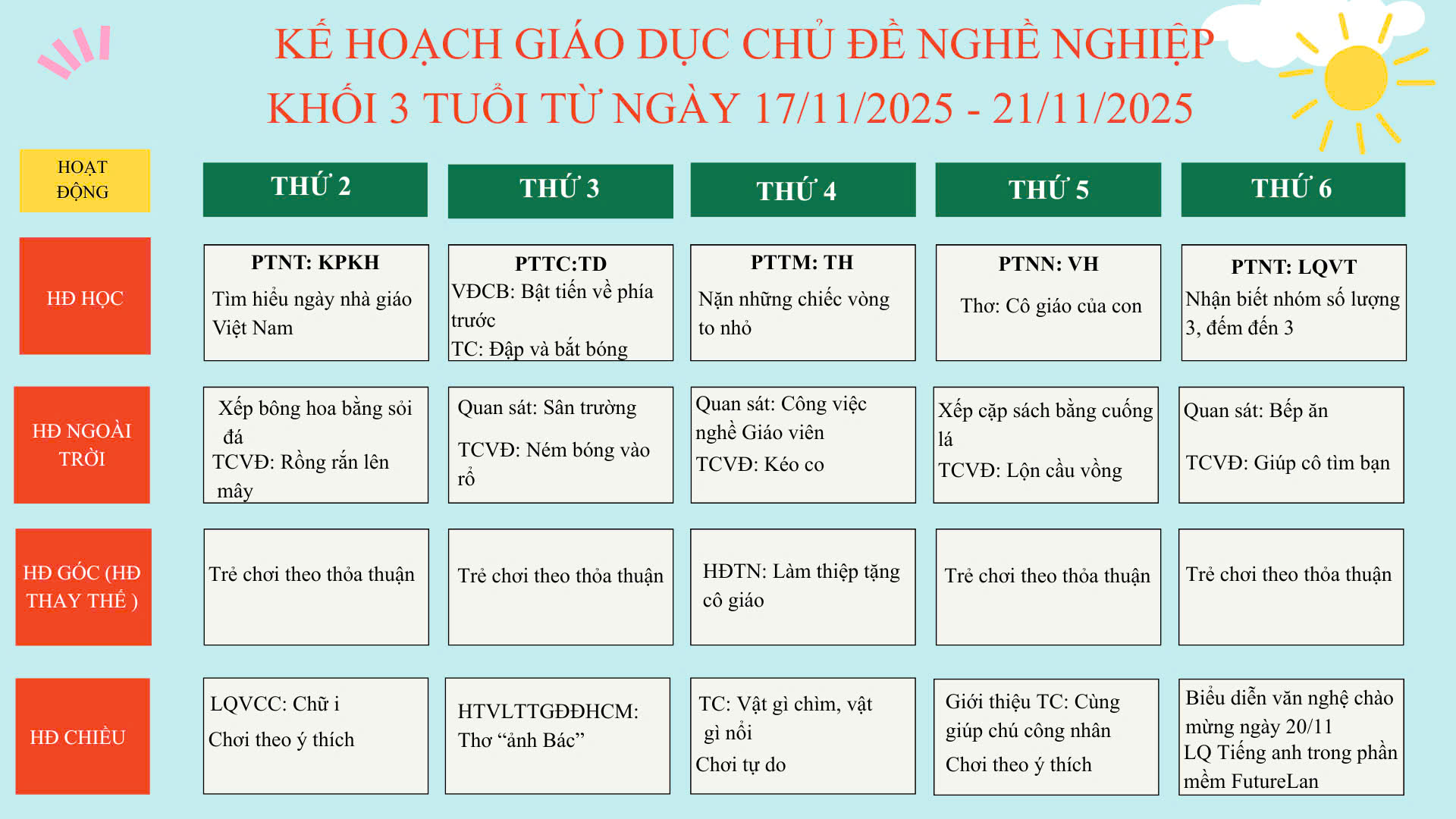 🌼 KẾ HOẠCH GIÁO DỤC TUẦN MỚI – CHỦ ĐỀ NGHỀ NGHIỆP 🌼 Khối 3 Tuổi | 17/11 – 21/11/2025