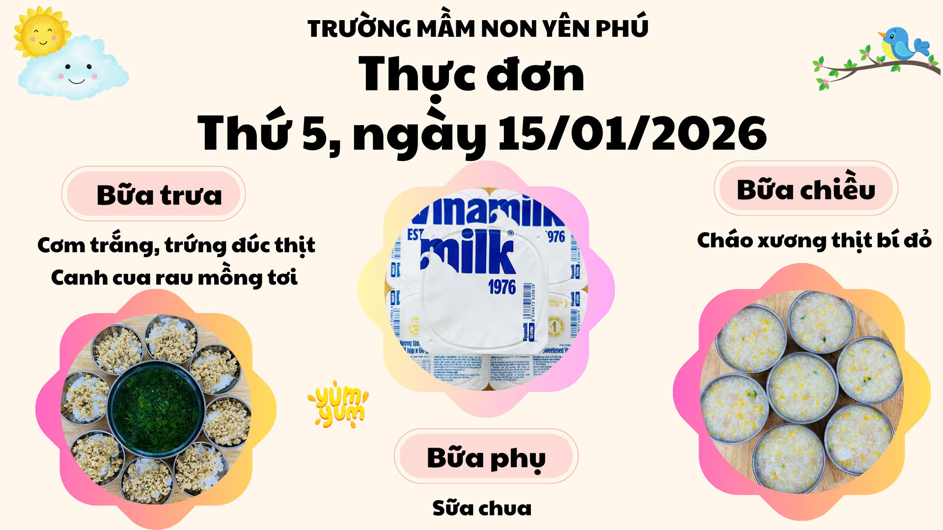 🍽️ THỰC ĐƠN THỨ 5 – NGÀY 15/01/2026 TẠI TRƯỜNG MẦM NON YÊN PHÚ 🏫 🏫