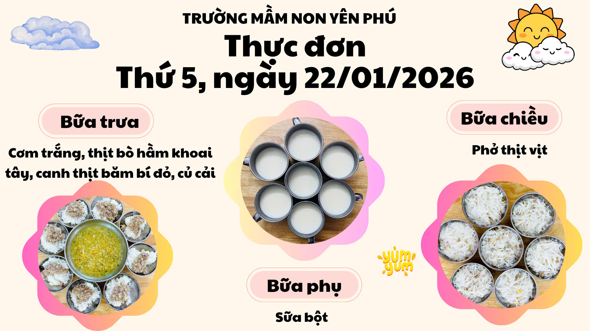 🍽️ TRƯỜNG MẦM NON YÊN PHÚ 📅 THỰC ĐƠN THỨ 5 – NGÀY 22/01/2026