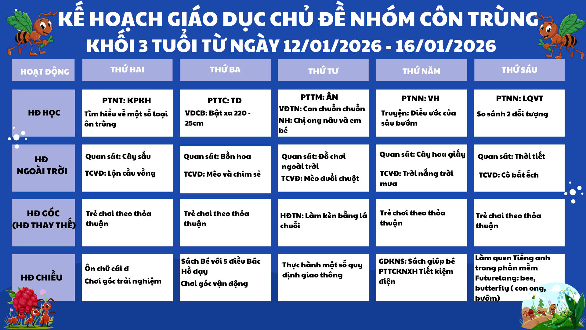 🐞🌿 KẾ HOẠCH GIÁO DỤC TUẦN Chủ đề: NHÓM CÔN TRÙNG – Khối 3 Tuổi