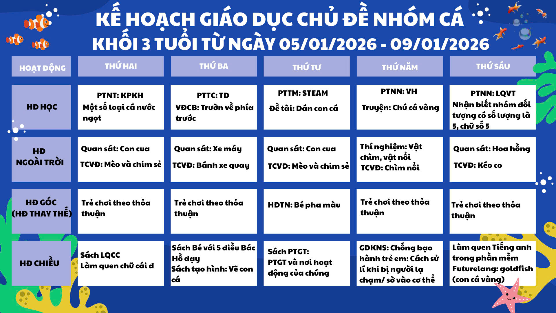 🐠🌊 KẾ HOẠCH GIÁO DỤC TUẦN CHỦ ĐỀ: NHÓM CÁ – Khối 3 Tuổi