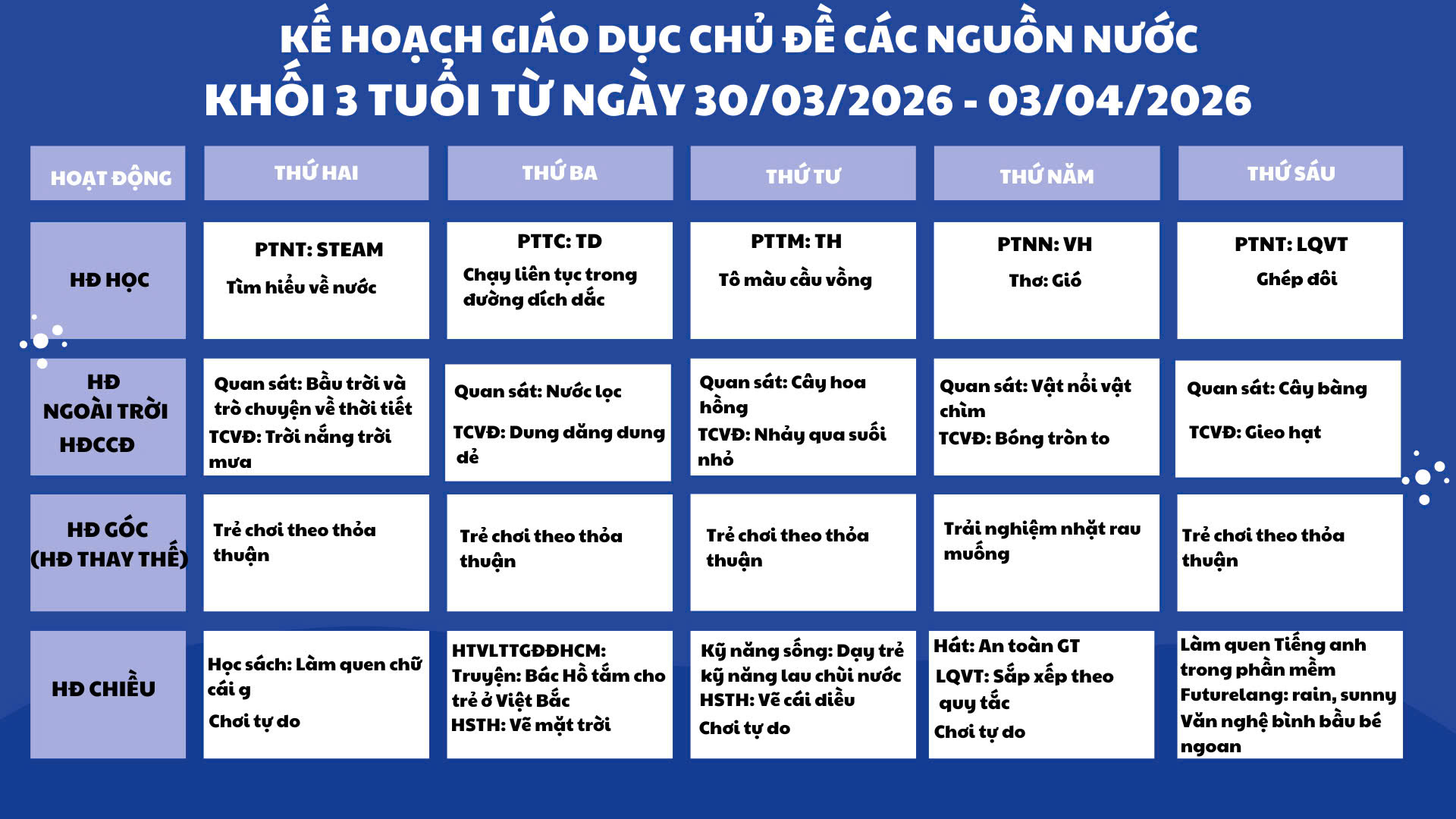 💧🌈 KẾ HOẠCH GIÁO DỤC CHỦ ĐỀ: CÁC NGUỒN NƯỚC 👶 Khối 3 tuổi